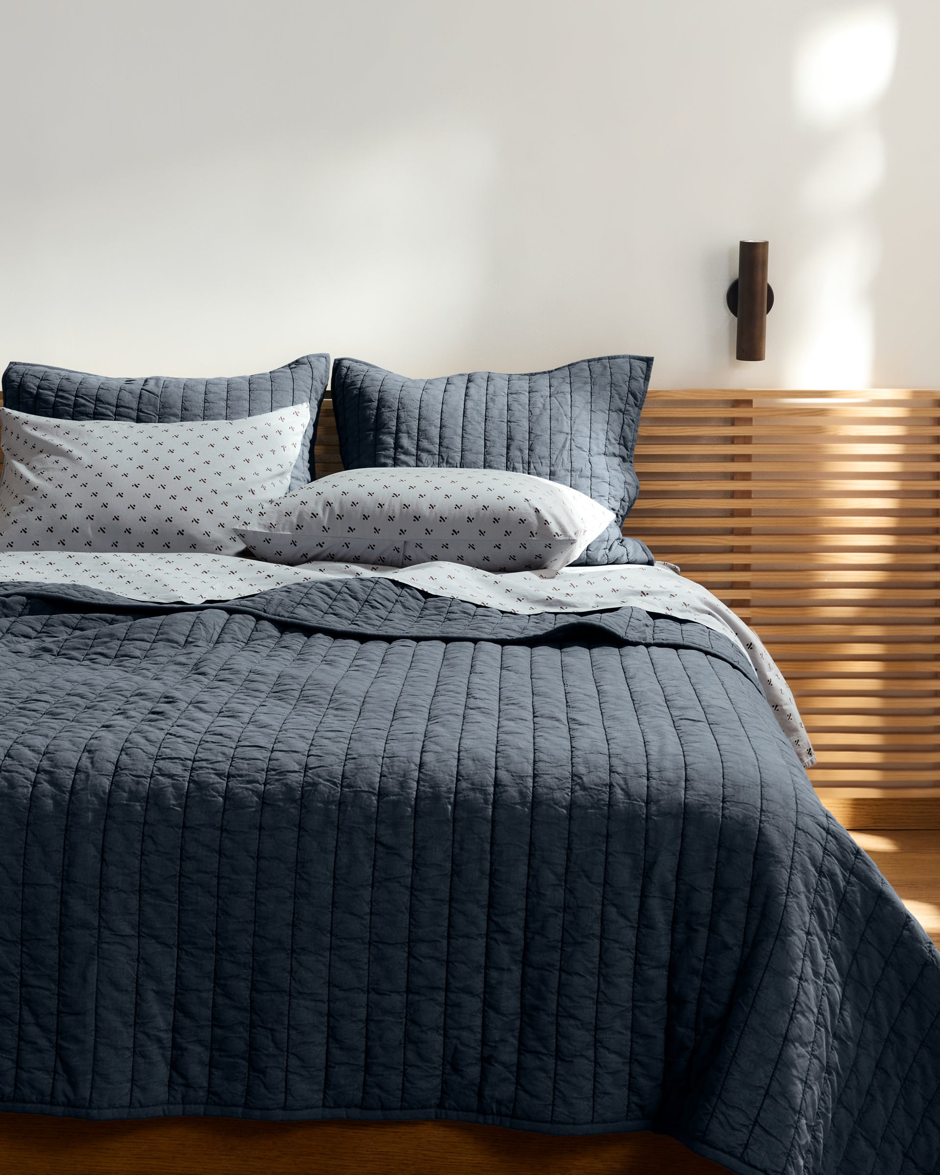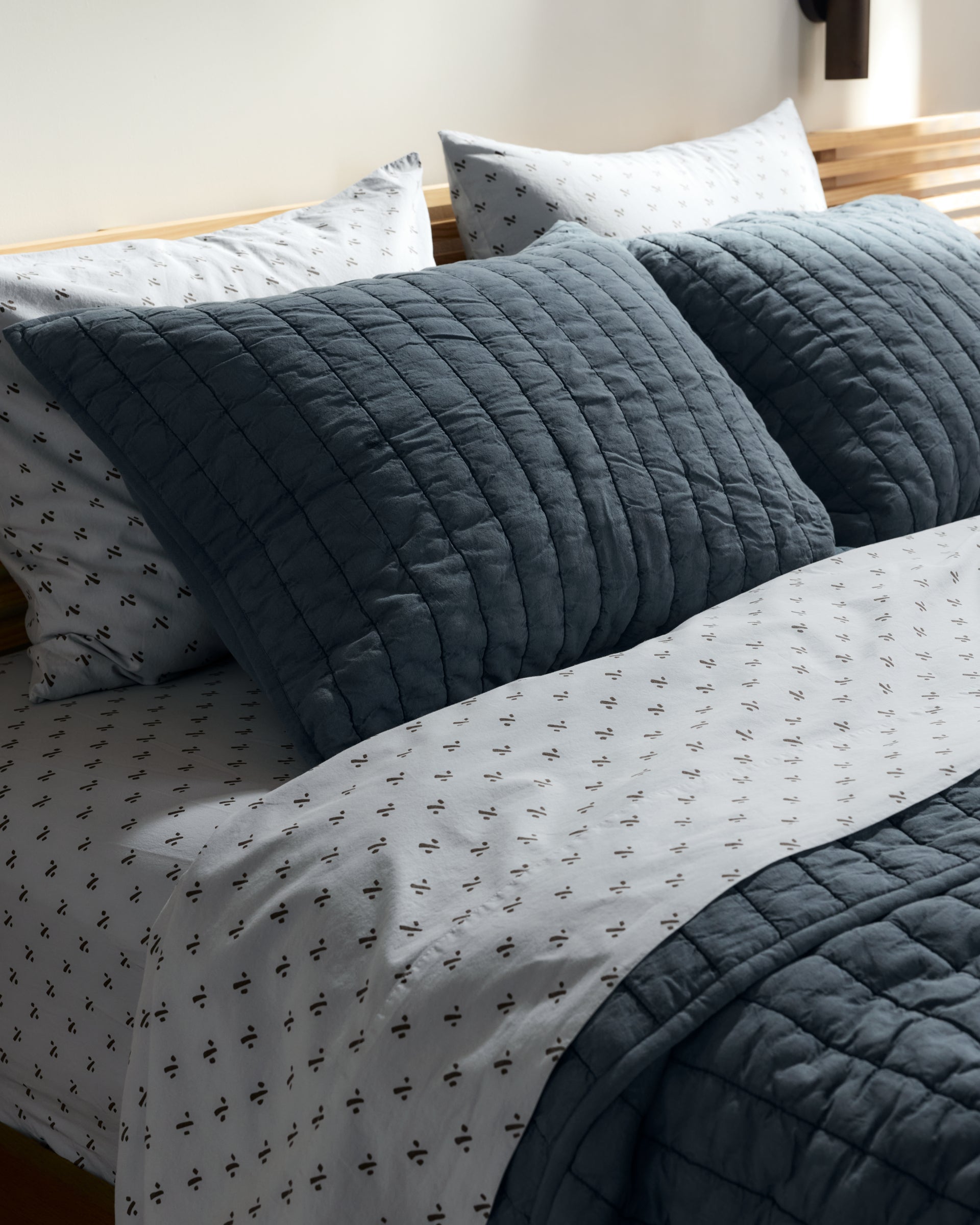 Finish the bed with soft structure and ease. Cut, sewn, then garment-dyed and washed, these shams feature subtle color variation and a gently timeworn feel. Channel quilting adds dimension while enhancing durability, for shams that feel familiar from the very first night.